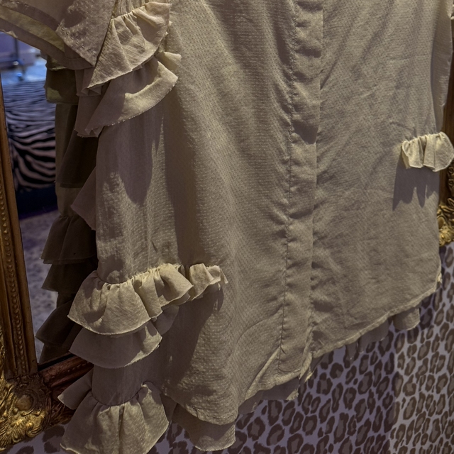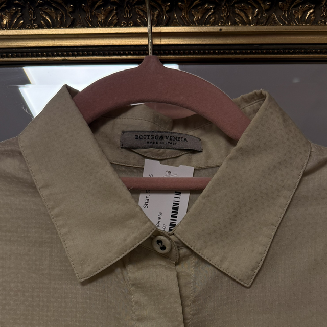 This short-sleeved Bottega Veneta shirt is so stylish. It has everything you could want in a shirt. It’s asymmetrical, textured, and has the most unique color (a sort of light green with a splash of white? Hard to describe, but absolutely gorgeous!!). The label says size 40, but I’d say it fits more like a Small. It does look quite slim. Italian sizing I guess...