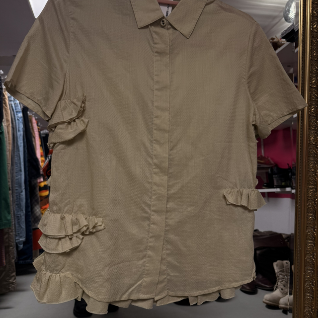 Dit overhemd met korte mouwen van Bottega Veneta is zó stylish. Het heeft alles wat je wilt in een shirt. Het is asymmetrisch, het heeft structuur en het heeft een bijzondere kleur (soort licht groen, met een splash wit? Lastig uit te leggen. Wel prachtig tho!!) Er staat maat 40, maar ik zou het een S geven. Ik vind hem namelijk best small ogen. Italiaanse maat I guess...