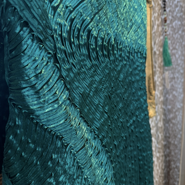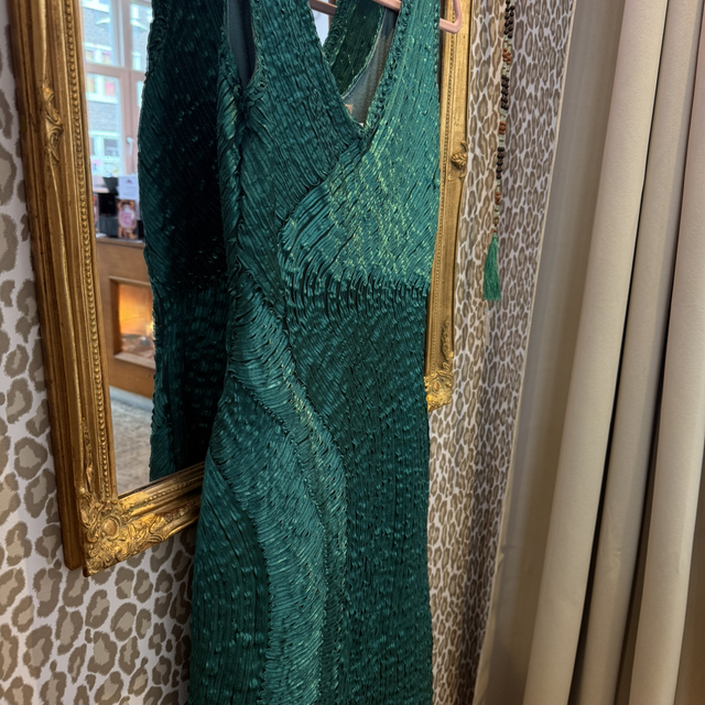 Deze groene Hunza jurk is een echte eyecatcher. Door de rijke structuur en het stevige, stretchy materiaal sluit de jurk prachtig aan op het lichaam. Het silhouet is uitgesproken form fitting, zonder in te leveren op comfort. De speelse figuren in de stof zorgen ervoor dat precies de juiste plekken worden geaccentueerd, wat de jurk een krachtig en vrouwelijk karakter geeft.
