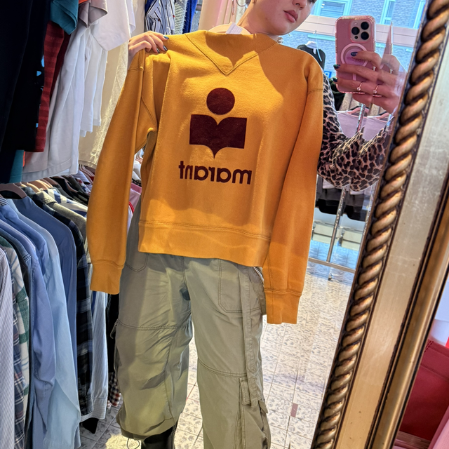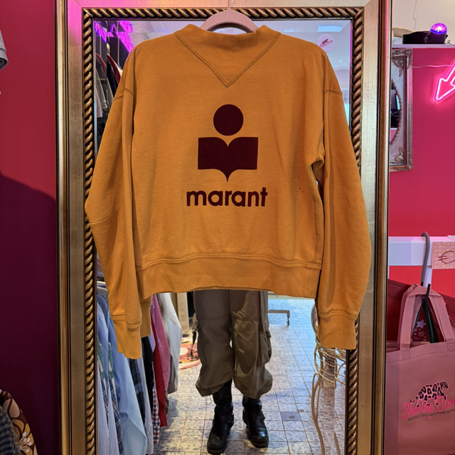 Een echte Isabel Marant eyecatcher. Deze trui komt in een warme mosterdgele tint met contrasterende rode letters, een combinatie die meteen opvalt maar toch tijdloos aanvoelt. Casual, cool en perfect voor wie houdt van kleur met een designer touch. Makkelijk te stylen met denim, zwart of juist ton sur ton.